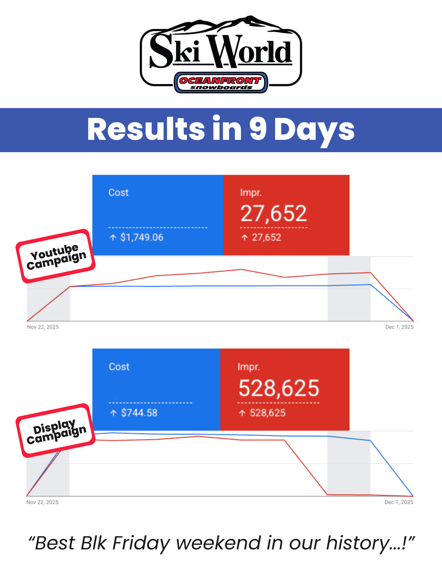 For my 2025 Black Friday campaign with Ski World Inc., I led the strategy behind both the YouTube and Google Display ads, focusing heavily on sharp ad copy and well-researched targeting. Every message was written to speak directly to high-intent shoppers, while the targeting was built around customer behavior, interests, and past performance data to make sure the ads reached the right audience at the right time. That combination paid off—the campaign drove strong engagement and sales and was ultimately recognized as the best Black Friday sale in the company’s history.